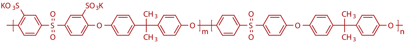 磺化單體與4,4‘-二氯二苯砜、雙酚A直接無分水條件下聚合,分子量、磺化度即離子交換容量以及磺酸基團位置得到精確控制,重復性得以保障,聚合快速,生產(chǎn)周期短、能耗低,實現(xiàn)低碳排放生產(chǎn)。